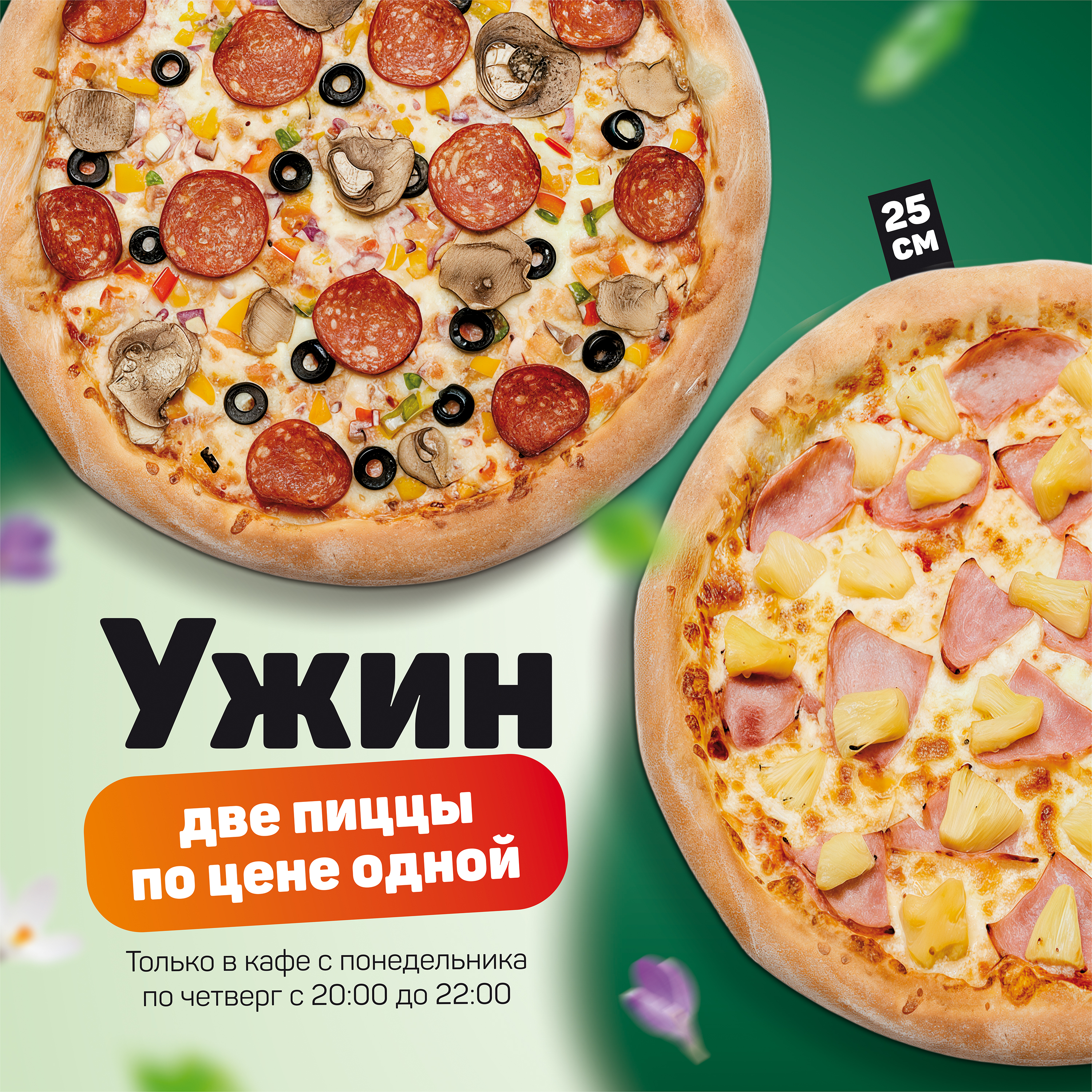 - Скидка 50% за две маленькие пиццы (25 см.).